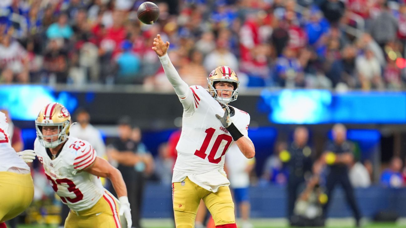 Jones’ fourth start as the starting quarterback brock purdy He is still dealing with a toe injury that he suffered in Week 1 and aggravated in Week 4. Purdy did not practice this week and was officially ruled out on Friday.