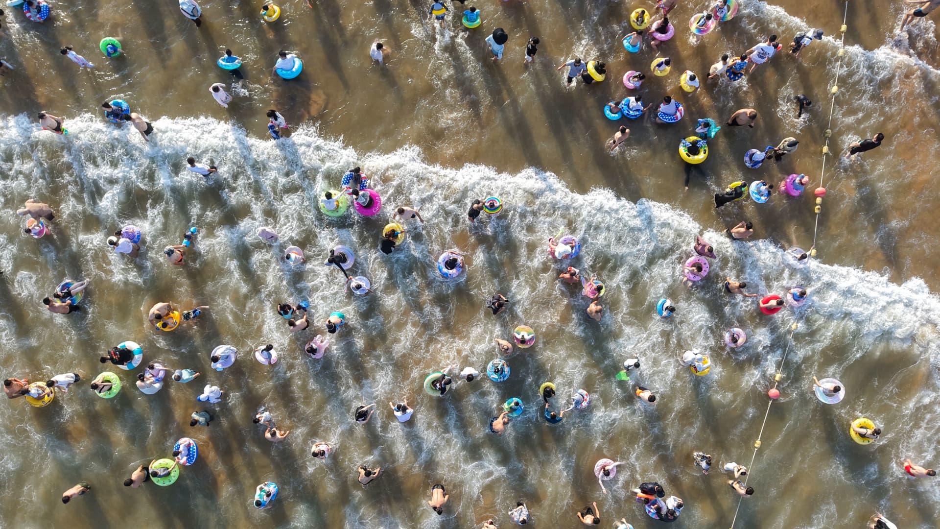 An aerial view shows people cooling off on a beach in Qingdao, in eastern China’s Shandong province on August 18, 2025.