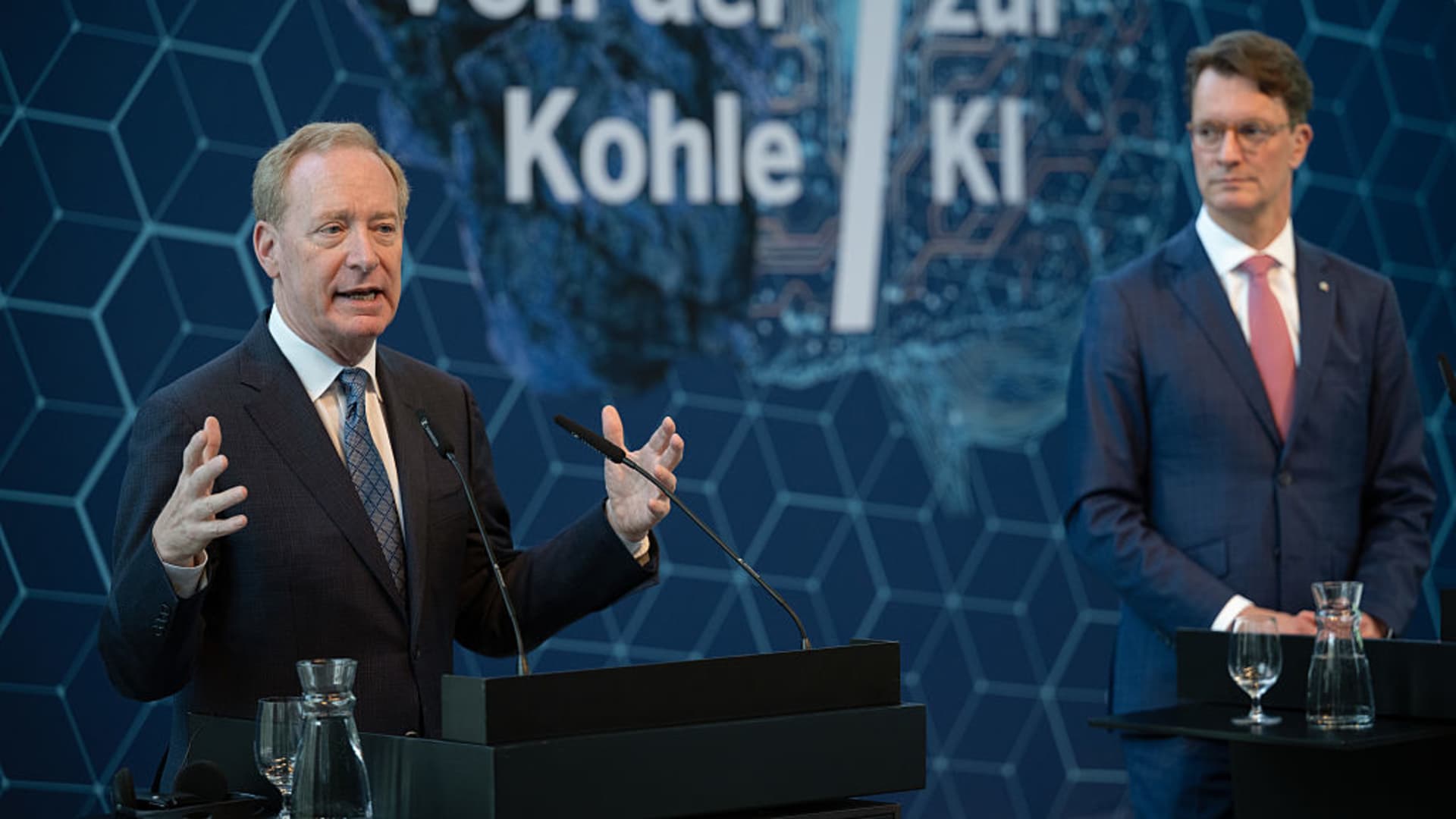 Microsoft President Brad Smith, left, speaks at a press conference on future visions for the development and application of artificial intelligence in education in North Rhine-Westphalia at the Representation of the State of North Rhine-Westphalia in Berlin on June 4, 2025. To his right is Hendrik Wüst (CDU), Minister President of North Rhine-Westphalia, in front of the sign “From coal to AI.”