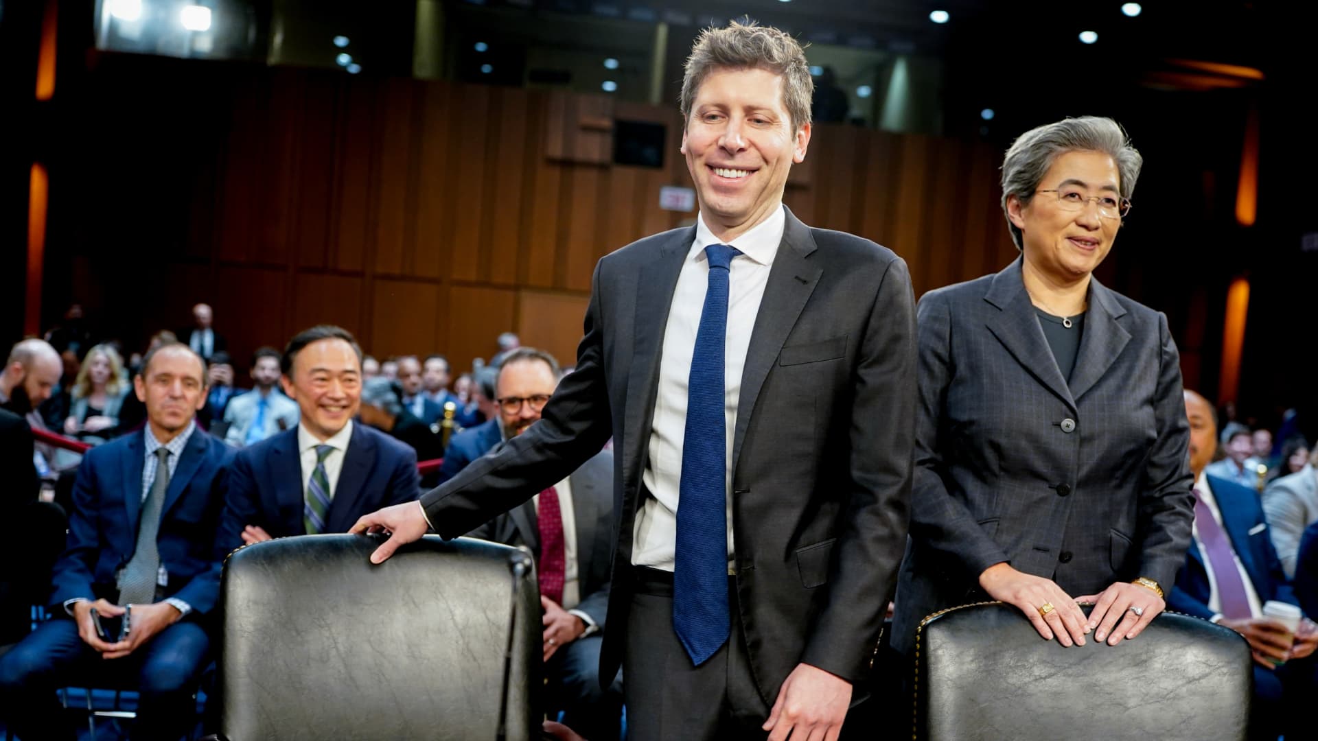 Sam Altman, chief executive officer of OpenAI, left, and Lisa Su, chair and chief executive officer of Advanced Micro Devices, arrive for a Senate Commerce, Science, and Transportation Committee hearing in Washington, DC, US, on Thursday, May 8, 2025.