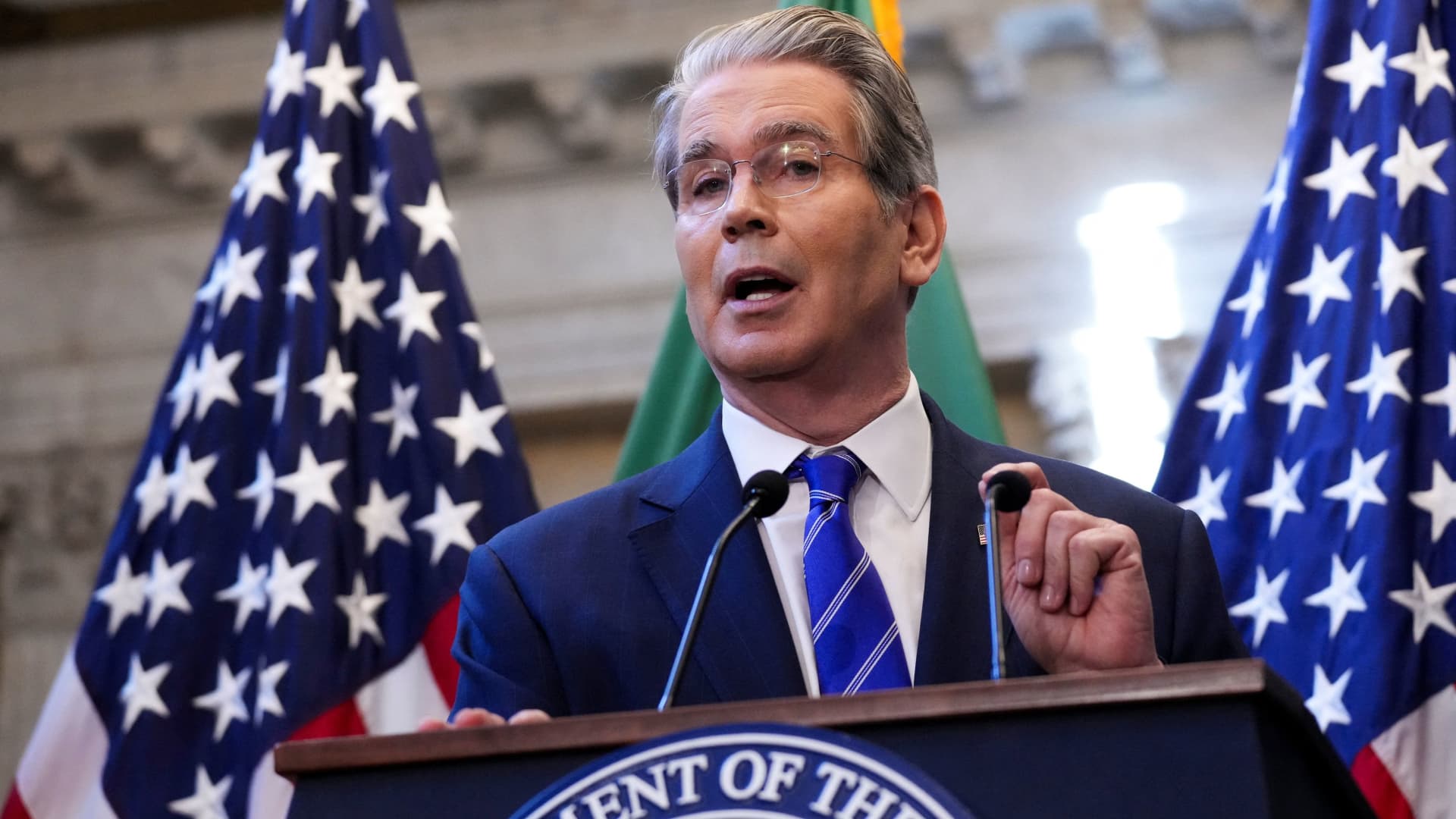 U.S. Treasury Secretary Scott Bessent speaks as he and U.S. Trade Representative Jamieson Greer hold a press conference on the sidelines of the IMF/World Bank annual meetings in Washington, D.C., U.S., Oct. 15, 2025.