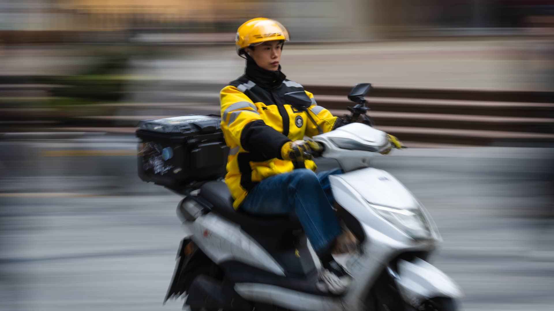 A Meituan food delivery courier rides an electric scooter in Chongqing, China, on March 29, 2025.