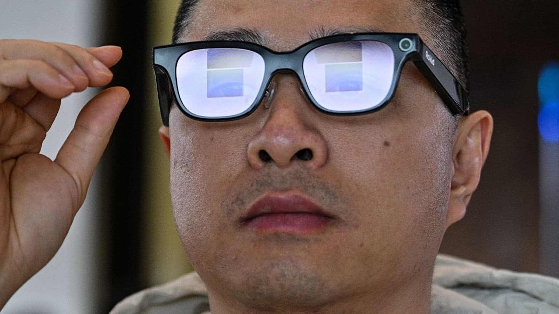 This picture taken on November 13, 2025 shows a man checking a pair of Rokid glasses with display and camera using artificial intelligence (AI) and augmented reality (AR) during a presentation event in Hangzhou, in China’s eastern Zhejiang province.