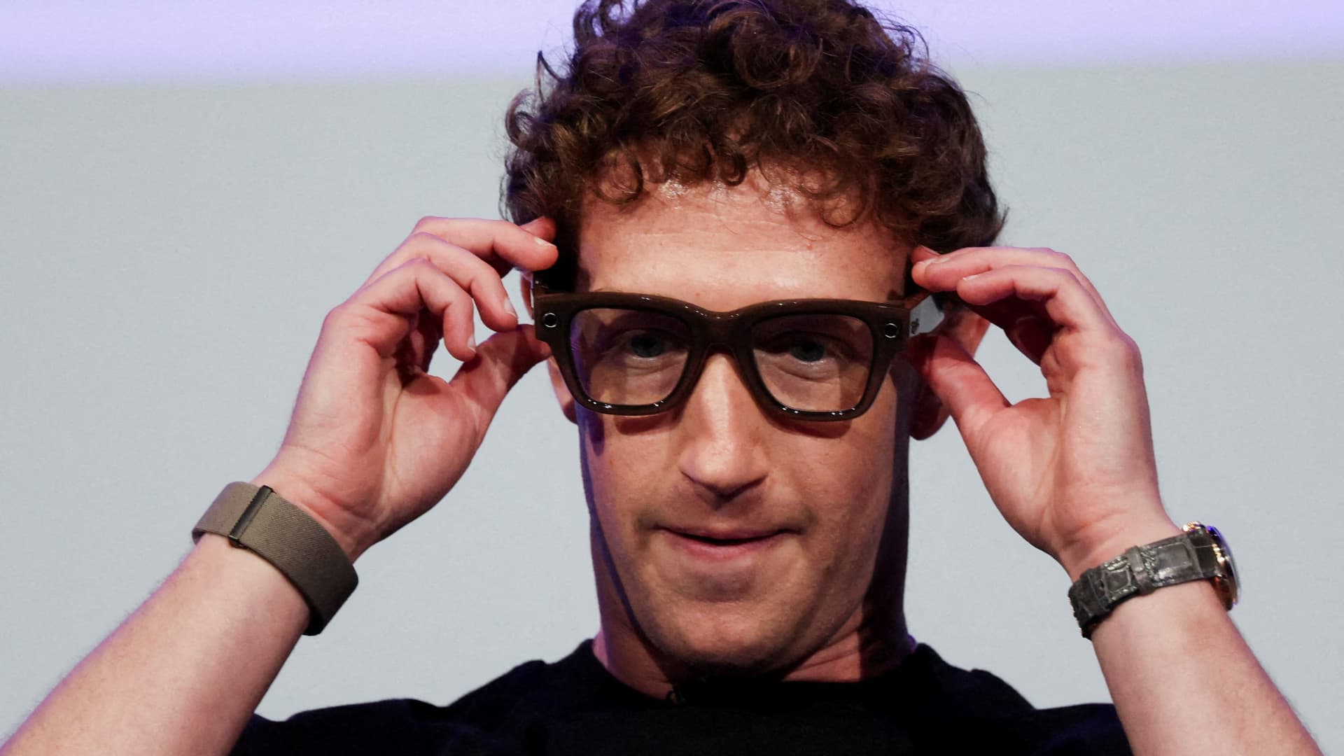 Meta CEO Mark Zuckerberg wears the Meta Ray-Ban Display glasses, as he delivers a speech presenting the new line of smart glasses, during the Meta Connect event at the company’s headquarters in Menlo Park, California, U.S., Sept. 17, 2025.
